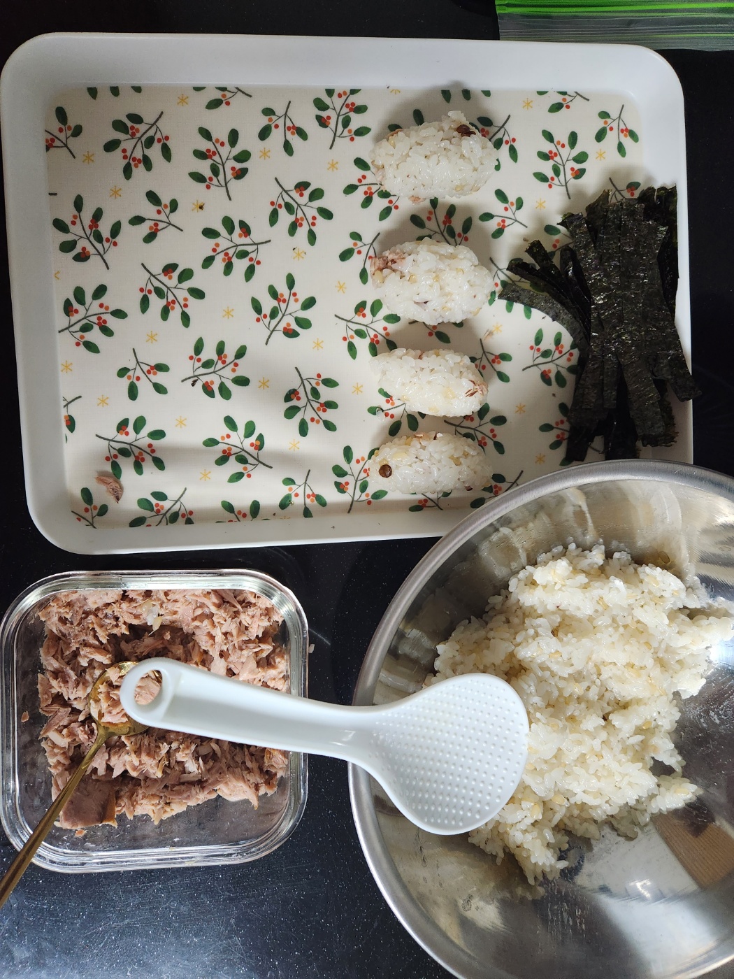 밥을 초밥 모양으로 말아서 참치를 넣습니다.