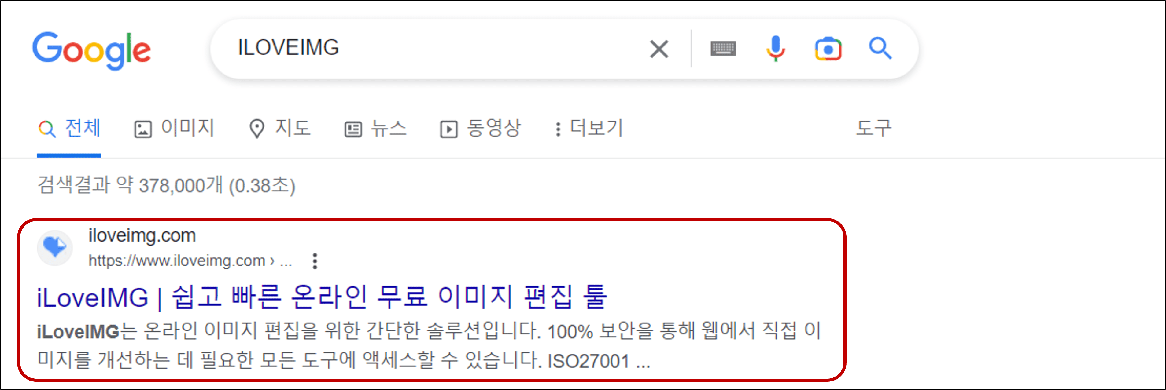 2) 검색 결과에서 iLoveIMG 홈페이지(https://www.iloveimg.com/ko) 클릭하다.
