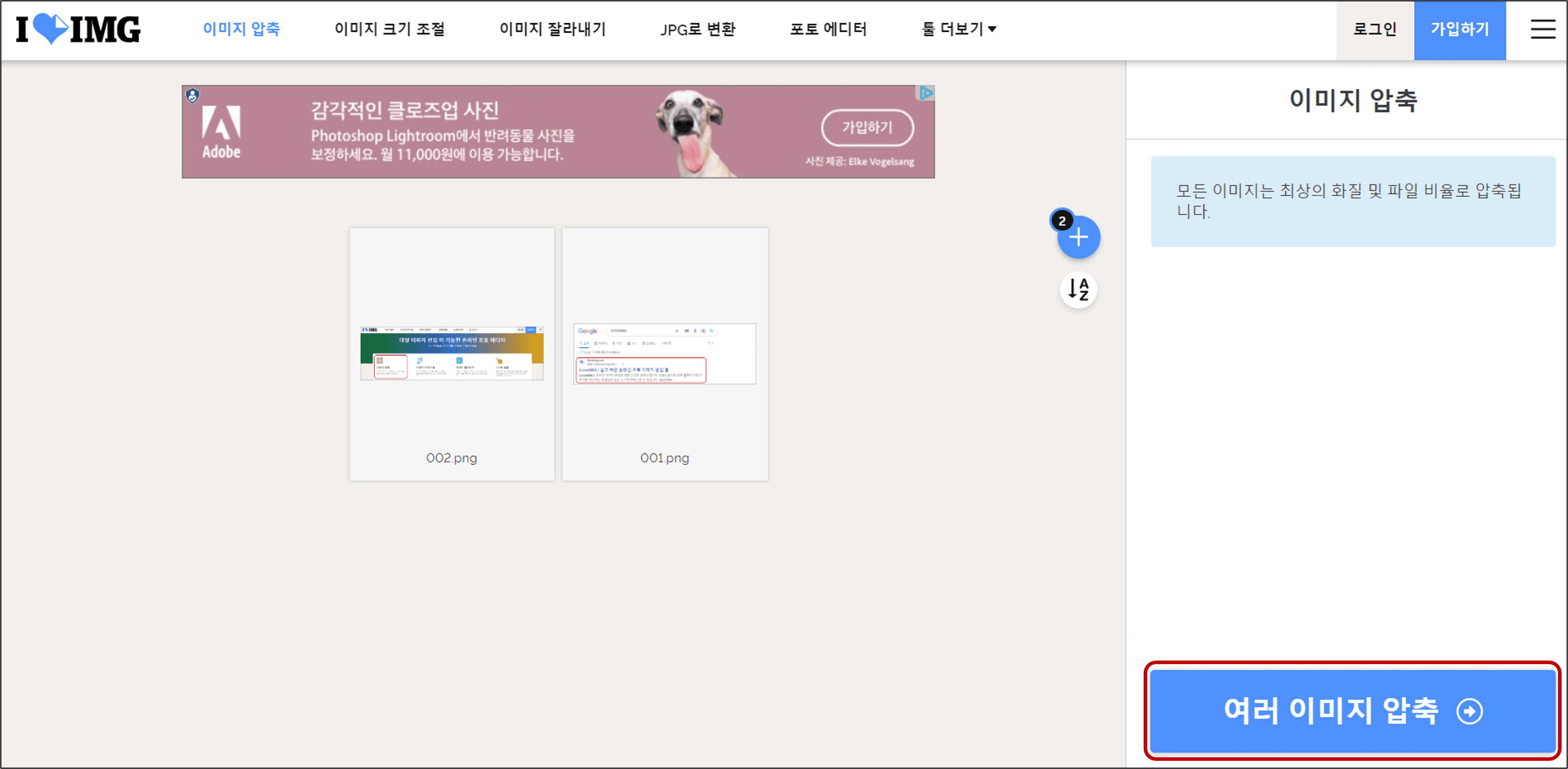 1) 모든 이미지 업로드 후 홈페이지 우측 하단 클릭 여러 이미지 압축 버튼을 클릭합니다.하다.