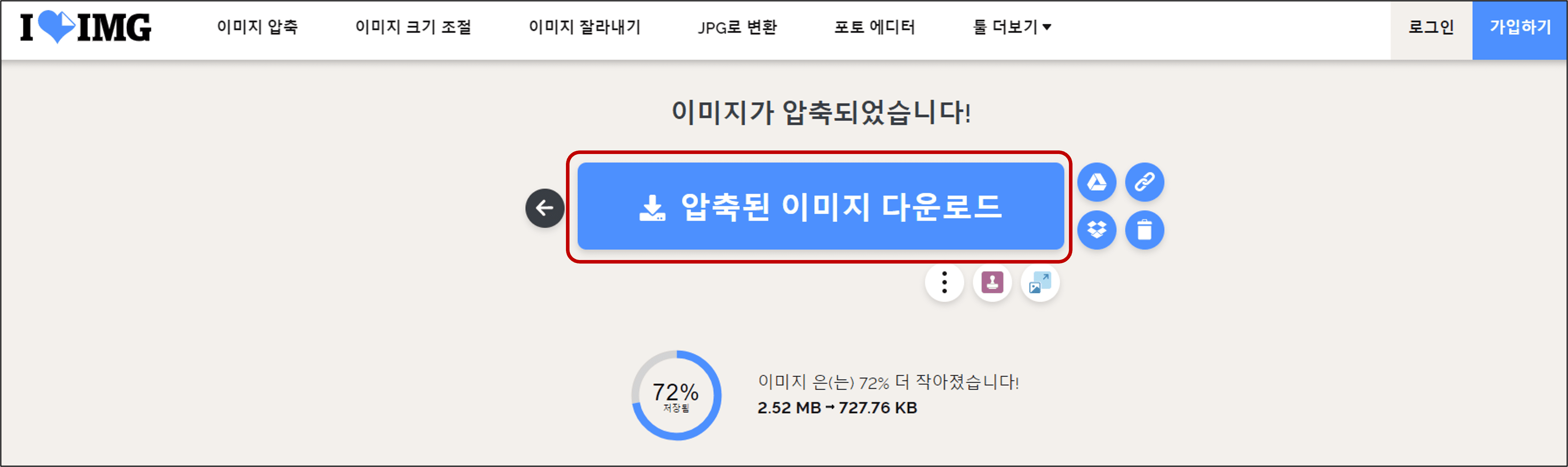 2) 일정 시간 후 결과 화면이 나타나면 화면 중앙에 압축 이미지 다운로드 버튼 클릭하다.