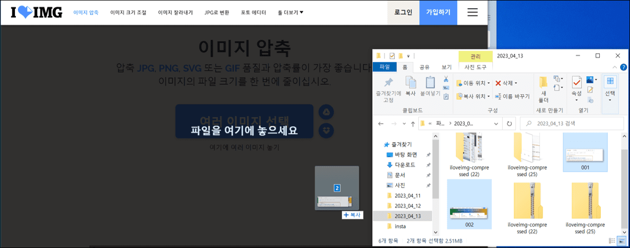 * 이미지 압축은 하나의 이미지 뿐만 아니라 동시에 여러 이미지에 대해서도 가능하므로 압축을 원하는 이미지를 모두 업로드 하세요.