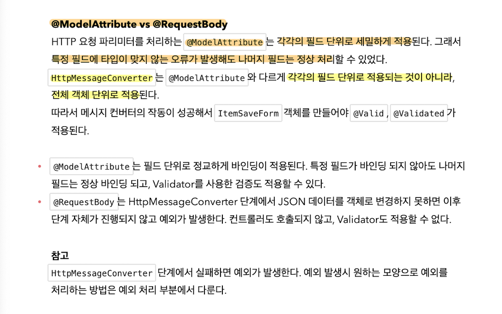 - addItem의 @RequestBody는 HTTP messageConverter에서 @RequestBody를 보고 ItemSaveForm으로 JSON 생성을 시도하지만 ItemSaveForm 객체 생성 자체는 tye error로 실패한다.